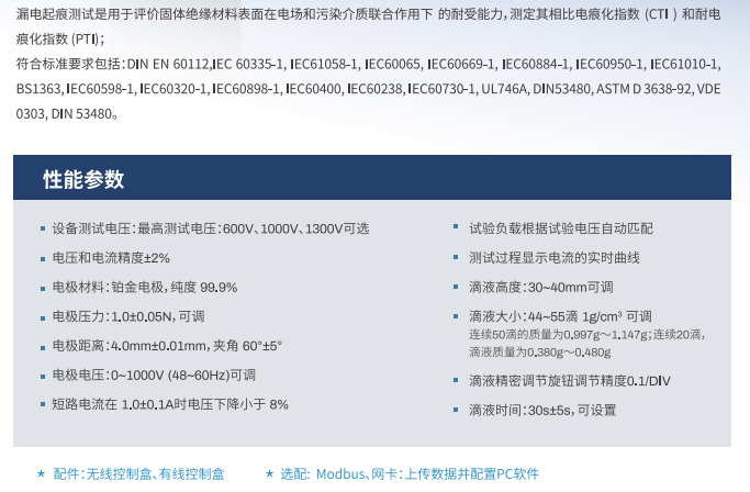 漏電起痕測(cè)試是用于評(píng)價(jià)固體絕緣材料表面在電場(chǎng)和污染介質(zhì)聯(lián)合作用下